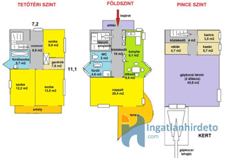 A TETŐTÉR szinten 3 szoba, gardróbszoba, fürdő és WC található.
