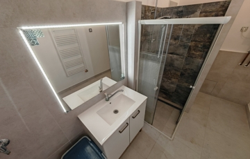 az egyik közvetlenül a hálószobából nyílik, amelyben épített zuhanyzó és kád is található, a másik a közlekedőből megközelíthető, és zuhanyzóval felszerelt, így a család vagy a vendégek számára is kényelmes megoldást biztosít.