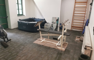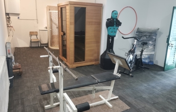 Az edzőterem különleges kényelmet biztosít: 3 személyes infra szauna, zuhanyzó is helyet kapott benne. A helyiség könnyedén egybenyitható a lakótérrel, így akár egy tágas plusz szobává alakítható, de igény szerint külön lakrésszé is átalakítható.