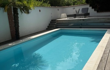 A hátsó teraszról nyíló kertben 8 × 4 méteres, gazdaságosan fűthető, nyakzuhanyos medence várja új tulajdonosát – tavasztól késő őszig használható, a köré épített faburkolatú napozóterasszal együtt valódi nyaralóélményt ad.