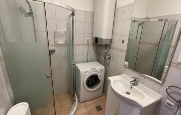 A fürdőszoba zuhannyal, törölközőszárítóval, mosdóval, wc-vel és mosógéppel szerelt.