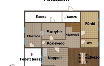 földszinten: tágas nappali, étkező, konyha, kamra, előszoba közlekedő, külön wc, fürdőszoba