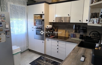 A konyha és a félszoba közötti válaszfal bontását követően egy nagy, 16 m2- es konyha - étkező lett kialakítva, modern bútorral, indukciós főzőlap + sütő és mosogatógép is van.