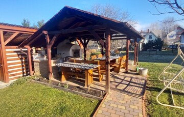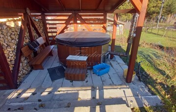 A rendezett, térkövezett udvar, fedett kerti pavilonnal és fával fűthető fürdődézsával, valamint egy hangulatos épített búbos kemencével is rendelkezik.