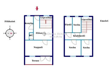 A felső szinten van 3 hálószoba, egy fürdőszoba és egy közlekedő. A fűtése új kondenzációs gázkazánnal megoldott, valamint az alsó szinten egy vízteres cserépkályha van, ami a teljes ház melegét biztosítja, mert a radiátorokat is lehet fűteni vele. De a felső szinten egy klíma is biztosítja a komfortos hőérzetet télen-nyáron.