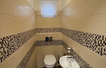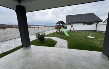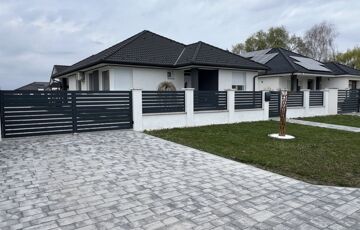 A 900 m2-es telek füvesített, parkosított, saját játszótérrel, térkövezett közlekedőkkel szolgálja a bérlő és vendégei kényelmét.