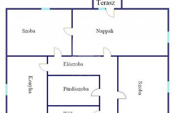 előszoba, konyha+étkező, WC, fürdőszoba+WC, nappali, 2 szoba, erkély(3m2).