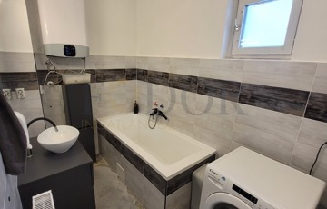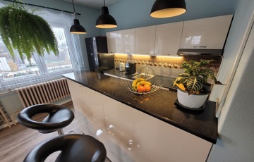 Modern Megoldások: Az új konyha és fürdőszobák stílusos felújításon mentek keresztül, minőségi burkolatokkal és egyedi konyhabútorral.
