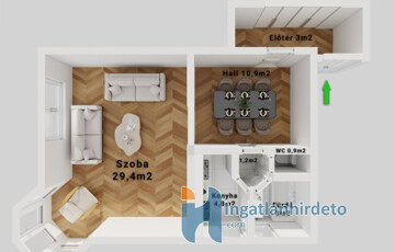 Az ingatlan előtérből, hallból, nappaliból, egy konyhából, 1 fürdőszobából, egy mosdóból áll.