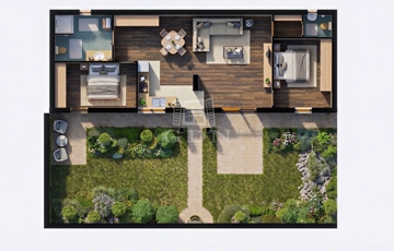Az épület kiváló elosztású, napfényes, teraszkapcsolatos, amerikai konyhás, tágas nappali, 2 hálószoba, fürdő, 2 toalett kerül kialakításra.