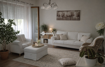 Az ikerház első fele belépve az ajtón egy kényelmes előszobát, balra egy konyharészt, konyhaszigetet, majd egy igazán tágas, fényekben úszó, kikapcsolódást biztosító nappalit rejt.