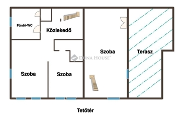 Az előszobából lépcső vezet fel a két tetőtéri szobába, ahol a kisebbik szoba gardróbbal is ellátott. Természetesen itt is fürdő-wc kiépítésre került.