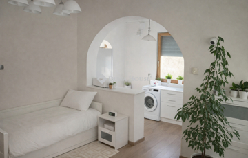 A másik házrészben egy kimondottan tágas étkezős-konyhát, nappalit, modern fürdő-wc-t és egy tárolót alakítottak ki. A lépcső egy szintén nagy méretű szobába vezet fel, ahonnan a 27nm-es teraszra léphetünk ki.