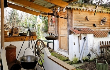 Auf der größeren Fläche befinden sich ein Pool, ein Brunnen, eine große Garage sowie ein Nebengebäude, das sich ideal für Tierhaltung oder landwirtschaftliche Nutzung eignet.