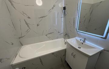 A fürdőszoba új burkolatokat és kádat kapott, a mosógép kiállása itt található.