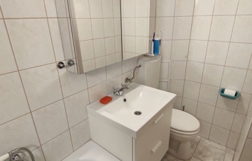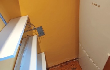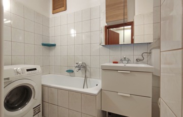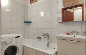 A konyha gépesített, 4 lángos gáztűzhely, fagyasztós hűtőszekrény, étkező székekkel a konyhában, kádas, toalettes fürdőszoba mosógéppel.