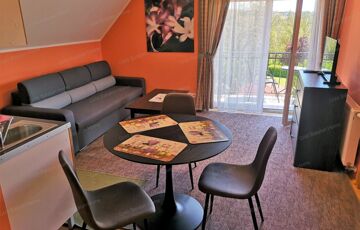 Férőhely: standard – 10 fő, a nappalikban lévő kihúzható garnitúrák igénybevételével max. 16 fő.