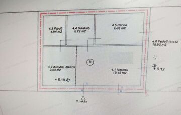 - 1-es lakás (50nm): nappali, konyha-étkező, fürdőszoba+WC, gardrób, szoba, 20 m2-es fedett terasz