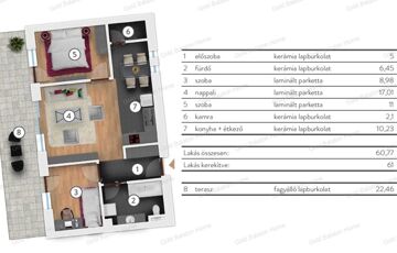 - lakótér: 60,77 m2 + 22,46 terasz