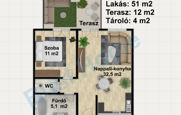 - A 12 m2-es tágas terasz, teljesen elszeparáltan található a többi lakás teraszától.