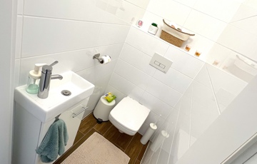 - A fürdő és a wc letisztult, fehér minimáldesign hidegburkolatot kapott