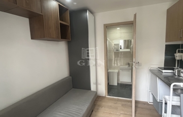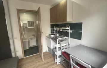 The space is maximized: a small kitchen with a dining table where you can comfortably enjoy your morning coffee, as well as a sofa that converts into a bed at night, making the apartment feel more spacious during the day and transforming into a cozy relaxation area in the evening. The bathroom features a modern walk-in shower.