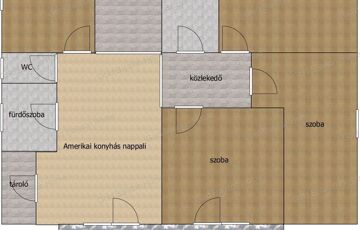 - Tetőtéri helyiségek: amerikai konyhás nappali, négy szoba, kettő fürdőszoba, külön WC, közlekedő, tároló, erkély.