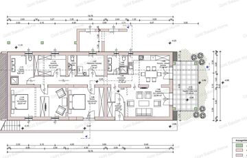 A lakás helyiségei: Amerikai konyhás nappali 40,48 m2, szoba 23,61 m2, szoba 15,14 m2, szoba 9,13 m2, fürdőszoba 9,61 m2, fürdőszoba 5 m2, háztartási helyiség 7,74 m2, külön WC 2,2 m2, közlekedő 11,76 m2, szélfogó 3,47 m2, fedett terasz 17,04 m2.