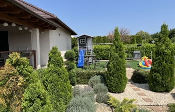 Világos, nagyvonalú terek, 68 m²-es nappali-központ, külön szülői lakrész – minden a kényelmes, jól élhető otthonról szól. Minőségi kivitelezés, átgondolt részletek, gondozott kert.