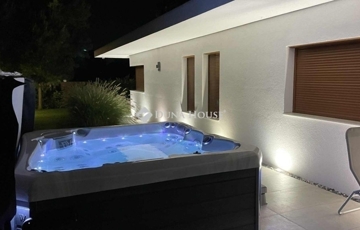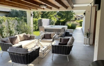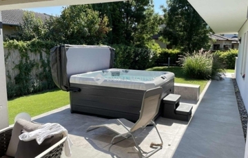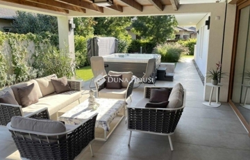 Az ingatlan egyik különleges eleme a 20 négyzetméteres fedett terasz, mely luxus kerti bútorokkal és egy 6 személyes, fűthető jakuzzival várja a pihenni vágyókat.