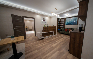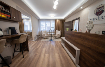 Az iroda mind a három helyisége világos, tágas, és a beépített bútorok, valamint szekrények révén praktikus megoldásokat kínál a mindennapi munkafolyamatokhoz.