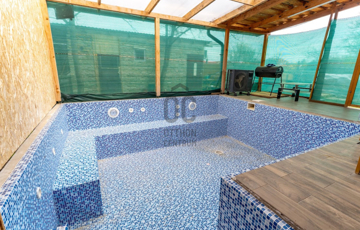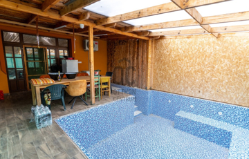 Hőszivattyú fűti a medencét, ami a teraszon található. Süllyesztett, és fedett, 120 centi mély.