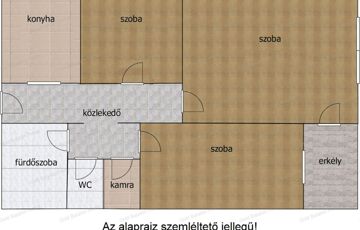 Lakás helyiségei: három szoba, konyha étkezővel, közlekedő, fürdőszoba, külön WC, kamra, erkély.