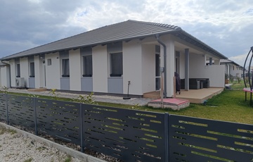 Az ikerházakhoz 450 m2 saját telekrész tartozik. Alapterület /netto/105 m2, + fedett hátsó terasz 21 m2, + dupla GARÁZS /40 m2/+ gépkocsi beálló ! .....-(( Össz.terület: Iker-fél+terasz+2 garázs-btto: 166 nm ))-.....