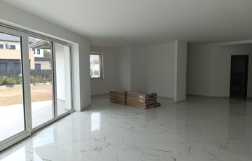 A szobák parkettával, a nappali és a többi helyiség márvány hatású greslapokkal burkoltak ! A burkolatok alatt 10 cm vastagságban lépésálló polisztirol .