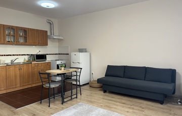 Az előszoba folytatásaként az amerikai konyhás nappaliba jutunk, mely garzonlakás mivoltából adódóan egyben a hálószoba szerepét is betölti. Jelenleg egy ággyá alakítható kanapé található benne.