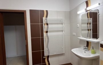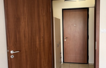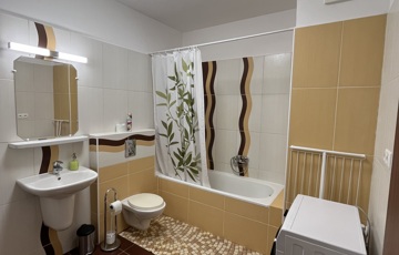 A lakásba lépve egy előszobába jutunk, melyből balra nyílik a káddal és mosógéppel ellátott fürdőszoba.