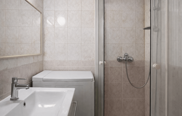 A fürdőszoba zuhanyzós kialakítású, a WC külön helyiségben található, a vízfogyasztás 2 db vízórával mérhető.
