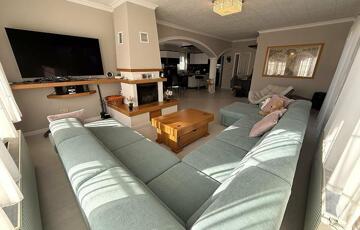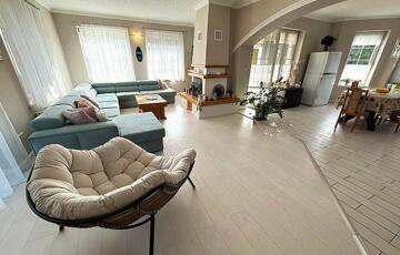 A földszinten tágas nappali található kandallóval, amely kellemes hangulatot teremt.