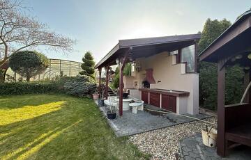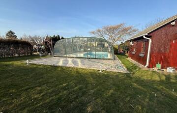 A telken, egy fűtött és fedett medence, valamint egy hangulatos kültéri kemence és grill sarok került kiépítésre.