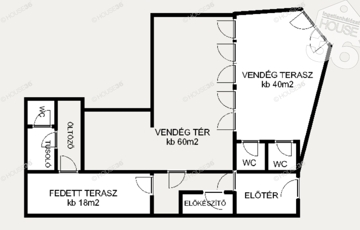 Közvetlen utcáról tágas kerti, burkolt teraszra érkezik a vendég, majd innen közelíthető meg a belső felújított vendégtér.