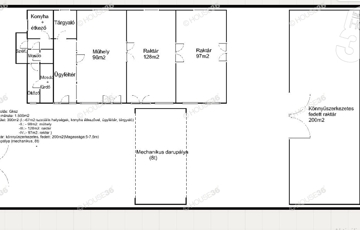 - Raktár: könnyűszerkezetes, fedett : 200 m2 (Magassága:5-7,5 m)