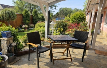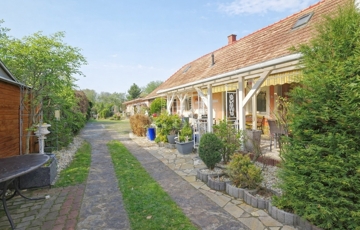 A gondosan kialakított telek gyümölcsfákkal, kúttal és ciszternával rendelkezik, így ideális választás kertkedvelők számára. A ház egyik különlegessége a fedett, déli fekvésű terasz, amely az utcáról nem belátható, így nyugodt pihenésre és kikapcsolódásra tökéletes.