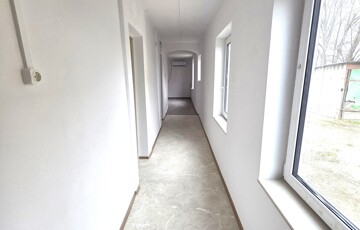 A ház elrendezése ideális, folyosóról nyíló szobák, konyha étkető, külön fürdőszoba és mellékhelyiség.