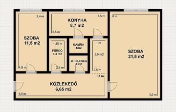 2 szoba, ablakos konyha, zuhanyzós fürdőszoba, mellékhelyiség, kamra.