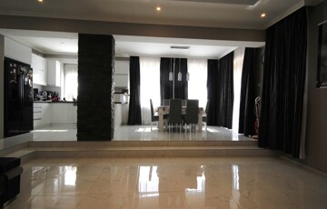 A központi tér déli és a terasz felől nyugati irányból, körbe napozott helyiség.
