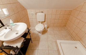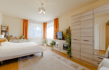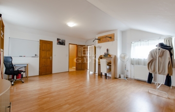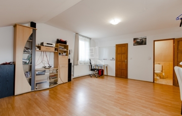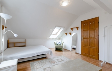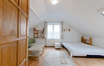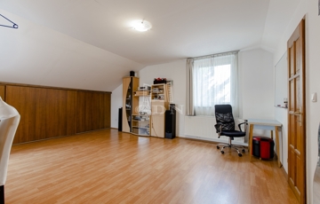 Szintén a közlekedőből jutunk fel a beépített teljes értékű tetőtérbe, ahol ki lett alakítva 2 db külön nyíló szoba, gardrób helyiség és egy zuhanyzós fürdőszoba. A nagyszoba további lehetőségeket rejt magába, szinte bárhogy lehet alakítani, akár 2 db szobává is.