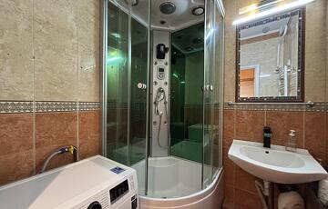 A fürdőszoba is teljes átalakításon ment át: új hidromasszázsos zuhanykabin került be, melynek köszönhetően tágasabb a tér és a mosógép is kényelmesen elfér.