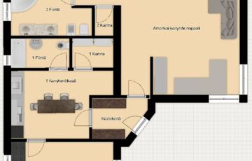• tágas nappali-konyha és közlekedő (~46 m²)