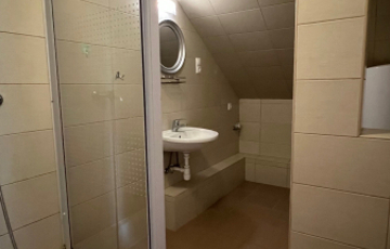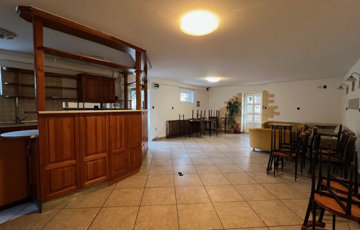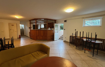 Szuterénben 1 db 5fős szoba plusz egy 60m2-es társalgó, konyha, ebédlő,1 fürdő, 3Wc.